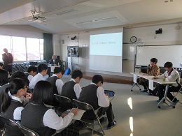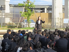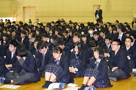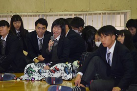 現在の進路を決めたきっかけや、学生時代にがんばったことなどが話され、在校生たちには大いに参考になったと思います。また在校生へのアドバイスとして「自分で熱中できるものを見つけ努力する」「出身校は関係ない。大切なのはがんばること。勉強して選択肢を広げること」「部や基礎科目など高校でしかできないことを大切にする」「周りと教え合いながら勉強することが大切」などのことばをいただきました。