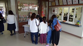 生徒玄関前、大忙しの3年生による模擬店。