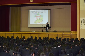 「教育ウィーク」が始まり、本校では「トップが語る石川の産業の魅力」と題して(株)金沢大地・代表取締役の井村辰二郎さんをお招きし、「夢を行動に」と題して講演をしていただきました。30代で農業に転職し、「1000年産業」を志した井村さんは、麦・大豆・米の有機栽培・加工・販売に乗り出したこと、また50歳になってワイン造りを始めたこと、そして地元密着で情報発信していきたいことなどを語ってくださいました。最後に「可能性は無限。まず夢を持つこと、あきらめないこと。夢を持ってまっこう勝負、まっこうチャレンジ」と締めくくられました。