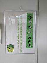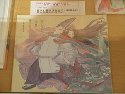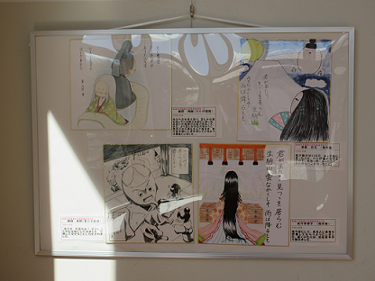 現在、校舎内2階西側ラウンジにおいて、「伊勢物語」に関する絵画、イラスト、色紙を展示しています。皆さんが古文の授業で学んだ「伊勢物語」の世界を追体験できる多くの作品が展示されています。これらの作品は、金城大学短期大学部のご協力をいただき、学生さんの作品をお借りしています。「伊勢物語の世界」を実感できるだけでなく、専門学科で培われた美術のテクニックを感じることもできる作品が揃っていますので、是非、一度見に来てください。