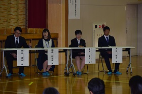 教育ウィークの行事として、「本校卒業生による講演会」が11月5日(月)午後、本校体育館で行われました。講師として、プロサッカーチーム・カターレ富山で活躍する大谷駿斗さんをはじめ、北陸先端科学技術大学院大学、EIZOエンジニアリング株式会社、金沢大学付属病院に勤める卒業生、計4人を招き、パネルディスカッションを行いました。「高校でつけたい力、社会で求められる力」と題して行われ、北村幸恵校長がコーディネーターを務めました。