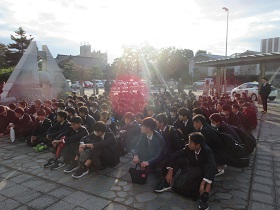 2018年11月14日 07時35分 修学旅行第1日を終えました。京都から新幹線で博多まで移動し、福岡県の「大刀洗平和記念館」にて平和学習をして来ました。館内見学と映画、朗読会など生徒は真剣に話を聞き、数名感極まる生徒もいました。施設を出る際には「想像以上に酷いことなのだ」と言う生徒もいました。