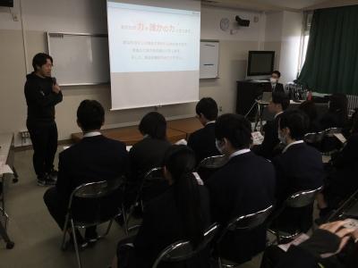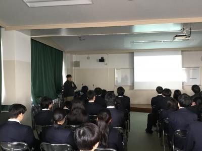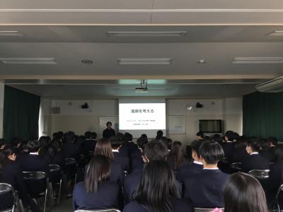 今回の講話では、本校進路指導課の山田先生と西田先生を講師として、3年生の進路実現に向けて、知っておかなくてはならないこと、進学事情、就職事情、進路決定するための考え方等について説明しました。