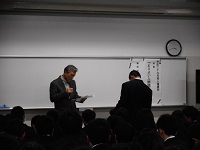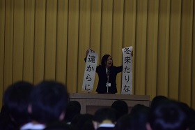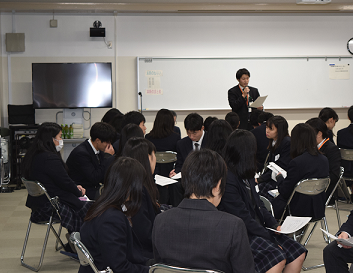 校歌斉唱の後、北村幸恵校長が全校生徒に向けて話をされました。「習慣」という札を掲げて、「悪い習慣を捨て、よい習慣を身につけてほしい」、「自他理解」という札を掲げて、「身近な他者はもちろん、遠い世界の出会ったこともない他者にも思いを馳せてほしい」、そして最後に「生命」の札を掲げて、「自分の生命を大切にしよう」と訓話されました。年が明けるといよいよ3学期です。どの学年も納得のいく仕上げの学期にしてほしいと思います。