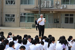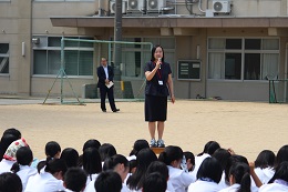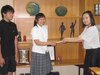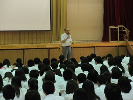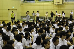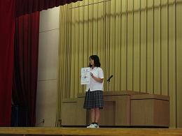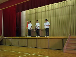 引き続き、生徒指導課からの夏休みの心構えについての話の後、表彰披露が行われ、自転車競技部やフェンシング部などの1学期の活躍が全校生徒の前で披露されました。