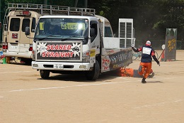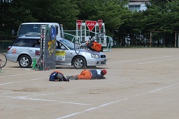 自転車と乗用車の追突事故、傘差し運転での自転車同士の衝突事故、スピードの出し過ぎによる自転車と歩行者の衝突事故などを、スタントマンが迫力ある演技で実演してくださいました。全校生徒540人あまりが参加、事故の恐ろしさを再認識し、自転車の乗り方やマナーを再度学びました。また、気温が高くなり熱中症が心配されましたが、無事終えることができました。