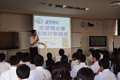 6月12日(月)の総合的な学習の時間を使って、進学希望者を対象に、推薦入試やAO入試に必要な「志望理由書」について講座を持ちました。書くための材料の扱い方や文章構成などについて、具体的な事例が紹介されました。書くのにコツのいる志望理由書ですが、基礎的な知識をえることができました。