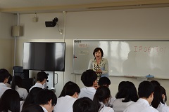 昨年、「ふるさとに学ぶクリエイティブ人材育成事業〕で学んだ考え方をもとに今年度は、6月19日(月)に、「高校生就職ガイダンス」を普通科2年生に対象に実施しました。厚生労働省の委託事業で、東京から講師として瀬戸先生にきていただきました。ワークブックを利用し、いずれ社会に出ていくために必要な態度と知識を学ぶことができました。面接で自信をもって自己PRする必要性があると感じることができました。また、参加生徒は、全員、お辞儀の所作を実践し、実りのある講義となったと思います。