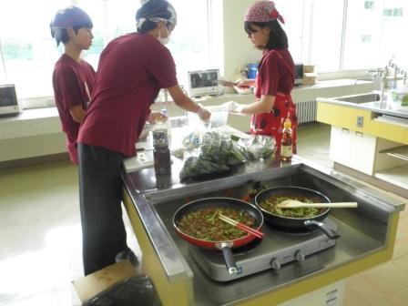 大量のキャベツを刻む33H(左)と焼き鳥の下準備に追われる32H(右)の調理係。
