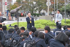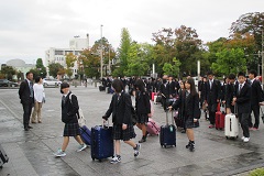 10月18日(火)の朝7:30に松任駅前(千代女の里俳句館前)に2年生が集合し、出発式を行いました。団長の卯野教頭先生、生活指導の竹内先生の話のあと、特急サンダーバード12号に乗り込み、九州へ向け出発しました。