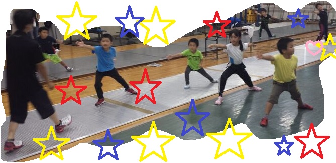 ファント(フェンシングのアタック)を練習するジュニアたち。しっかりと腕が伸びていますね!