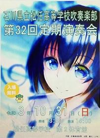 6/4(金) 津幡町文化会館シグナスで開かれた県高等学校総合文化祭吹奏楽演奏会に出場しました。また、部員全員でステージ係として運営を手伝いました。閉会式では水野創太君が生徒副委員長として閉会の言葉を述べました。