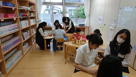 3年生が6月で引退し、現在は1年生5名、2年生2名の7名で毎週金曜日に活動しています。主な活動内容は学校の近くの児童センターで小中学生の遊び相手やレクリエーション補助、花壇の手入れや施設内の清掃などの職員の方のお手伝い等をしています。その他、地域のボランティア活動にも積極的に頑張って行きたいと考えています。