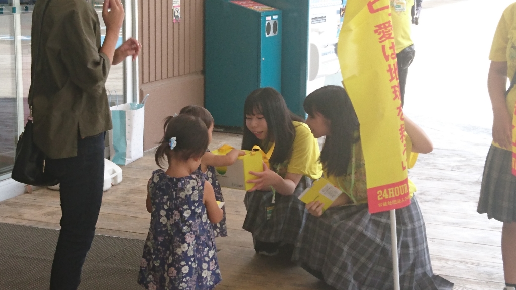 8月25日、白山市のラスパ白山で行われた24時間テレビチャリティー募金活動に参加しました。たくさんの方に募金に協力していただき、ありがとうございました。最初は恥ずかしくて大きな声は出せませんでしたが、「がんばってね」「ごくろうさま」と温かい声をかけてもらうと、自然に「募金お願いします」「ご協力、ありがとうございます」と笑顔で言えるようになりました。暑い日で大変疲れましたが、この活動を通して人の温かさ、優しさを感じることができました。