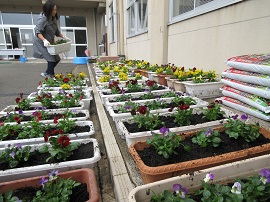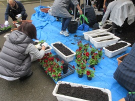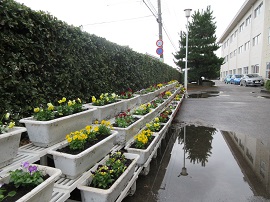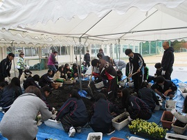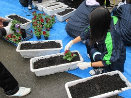 第2回植栽事業を11月4日(土)9:00より行いました。小雨の降る中、50名のPTA役員や保護者のみなさん、生徒、教職員が、360株のパンジーやビオラをプランターに植えていきました。これから寒さが厳しくなっていきますが、来春はきれいな花を咲かせてくれると期待しています。