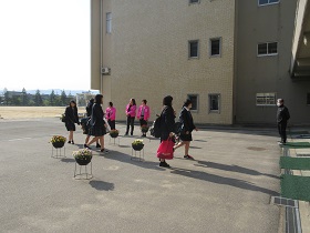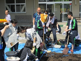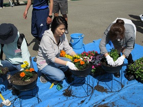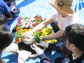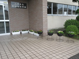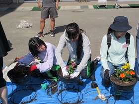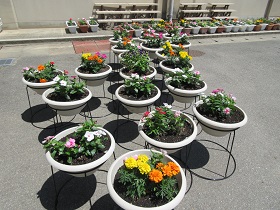 今年度「第1回植栽事業」が、6月2日(土)に行われました。徳田豊PTA会長、山口亜矢花と緑委員長の挨拶のあと、保護者、環境委員や吹奏楽部の生徒、教員が一斉に花を植えました。マリー・ゴールド、ニチニチソウ、トレニア、サンパチェンスの4種の花を植えました。ボール型プランタ、長方形プランタ100個にどんどん植えていき、正面玄関と生徒玄関に並べました。