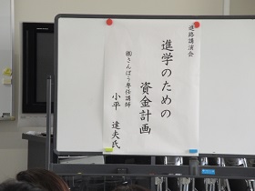 総会に先立ち、進路講演会が行われました。(株)さんぽう専任講師で富山短期大学の教員の小平達夫さんが「進学のための資金計画」と題して講演をされました。「奨学金は借入金である」「奨学金を入学準備金としてあてにするな」「いくら借りるか、ではなく、毎月いくら返済するか、を考えて」など、参考になる事柄がたくさんありました。保護者は熱心に聞き入っておられました。