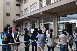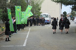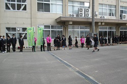 PTA役員、生活指導委員の保護者や教員が、校門前や生徒の通学路の要所要所に立ち、あいさつ指導や登校時のマナー指導を行いました。また校門では3日間、各学年の3組の生徒が交代に立ち、登校する友人に代わる代わる「おはようございます」と声をかけました。