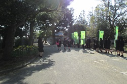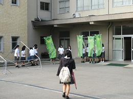 「第1回あいさつ運動」が、4月18日(火)から行われる予定でしたが、初日は荒天のため、急遽、中止になり、19日(水)から3日間にわたって行われました。生徒会役員、部・同好会にPTA役員も加わって、大勢の人が校門や生徒玄関前に並び、朝のあいさつを交わしました。本校キャラクター「まつのねくん」をあしらった新たな幟旗も10本用意されました。