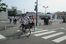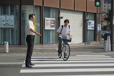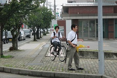 月曜からの「あいさつ運動」にともない、本日は「第1回自転車乗車マナー県下一斉指導」日で、PTA生徒指導委員の方々や教職員が、要所要所に立ち、指導を行いました。