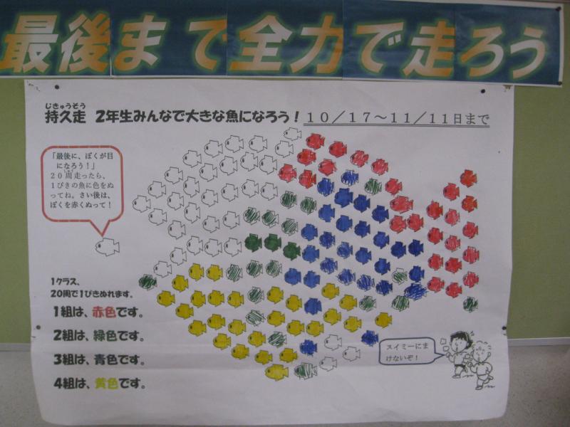 1クラス20周すると、学年の持久走カードに1匹のスイミーの色をぬっていきます。