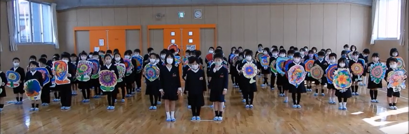 図工の時間に作った大きな「ありがとうの花」をもって歌いました。