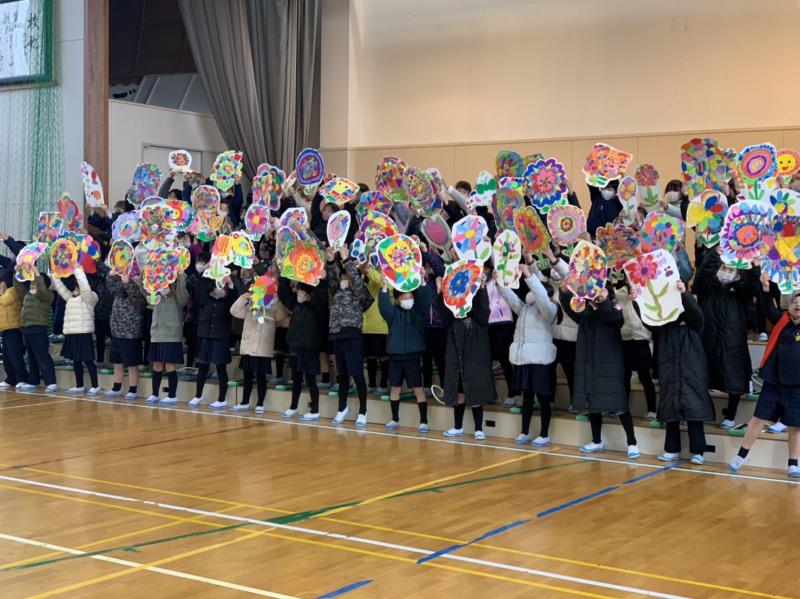 図工でつくったありがとうの気持ちのつまった花たちをもって歌う「ありがとうの花」も