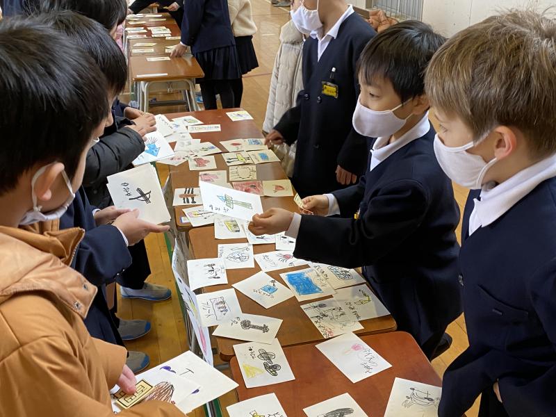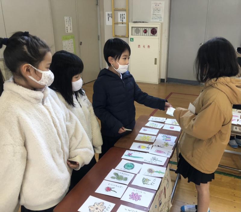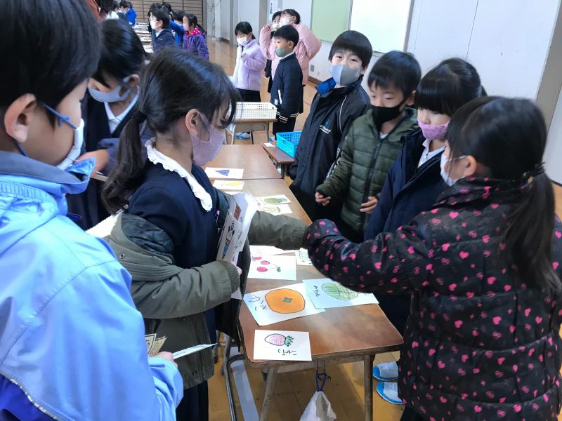 国語の「ものの名まえ」の学習のゴールとして、八百屋さん や 魚屋さんなどなど、グループでお店屋さんを作りました。2年生を招待して喜んでもらうことを目標に、品物集め・品物のカードづくり・看板づくり・「いらっしゃいませ。」「100円です。」などの言葉の練習など、3週間準備を進めてきました!