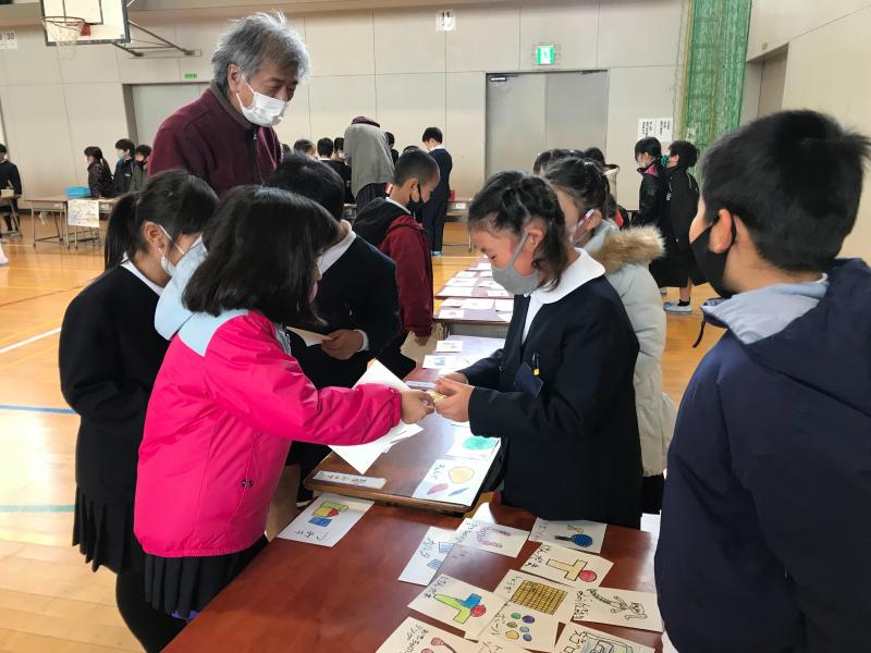 ①たてわりでお世話になった6年生のことを考えながら、図工の時間に作ったメダルを渡しました。