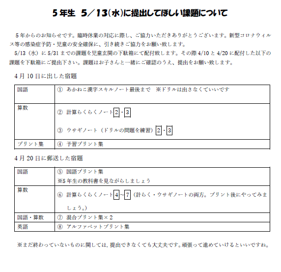 5月13日(水)に提出する物と追加の課題についてのお知らせを下記に添付いたしますので、ご確認下さい。