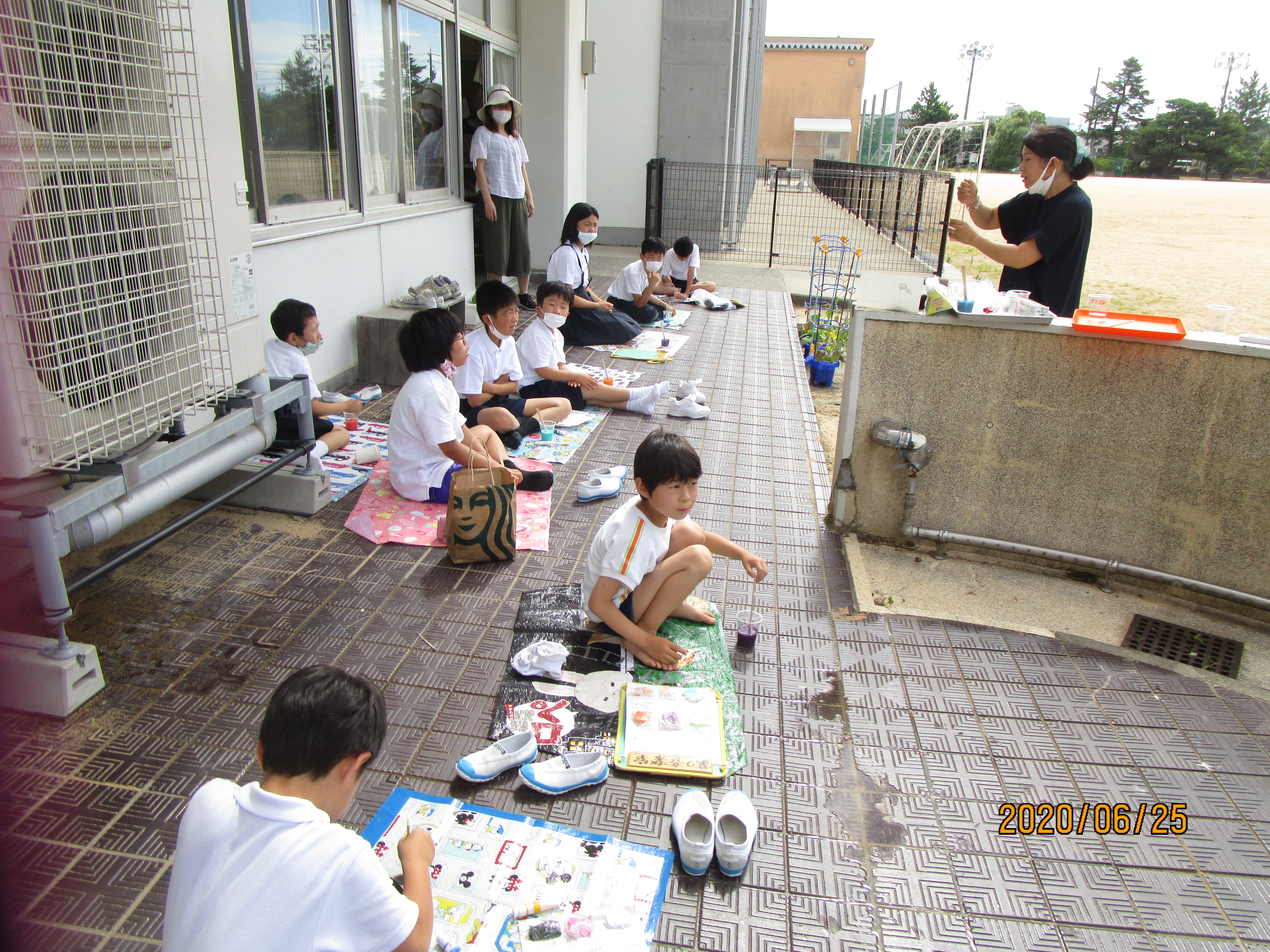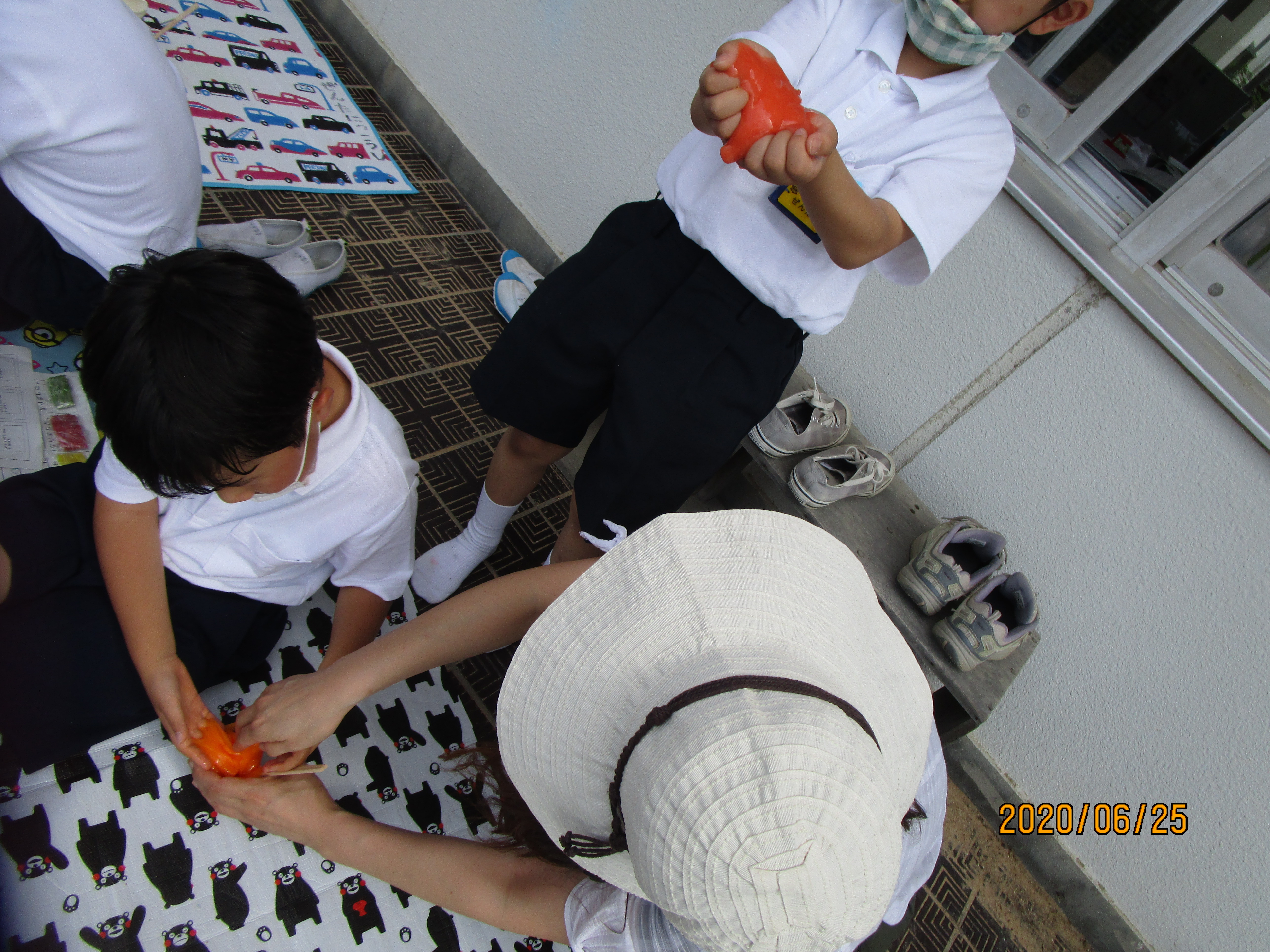 「スタンプ!スタンプ!」では、どんな形の跡が出るかわくわくしながら、思い思いに楽しむことができました。大きな模造紙にどんどん押して、班それぞれの模様ができました。材料・着替えの用意をありがとうございました。