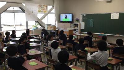 全学年からの動画の発表は、どれも1年生に合わせた内容になっていて、子どもたちはテレビ画面にくぎ付けになりながら大喜びで会を楽しんでいました。