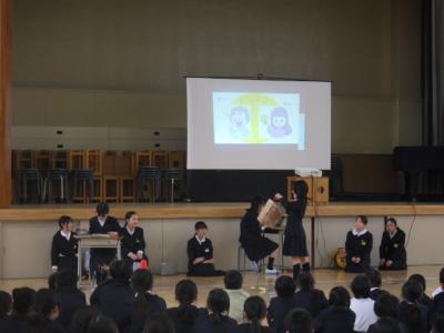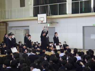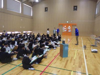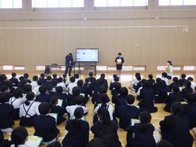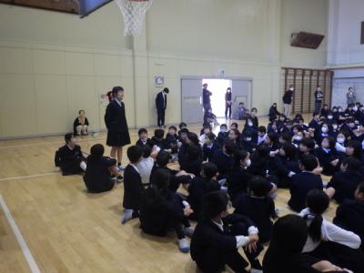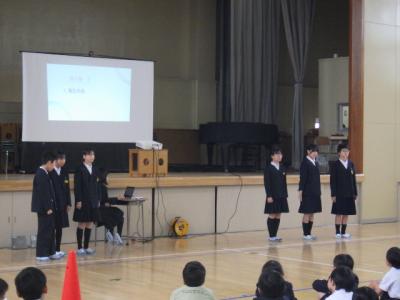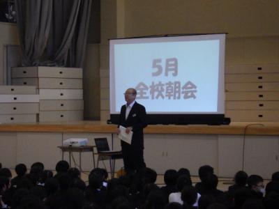 5月の全校朝会を行いました。前半は校長の話、生活目標の話、安全の話です。校長からは5月のポイント「学び合い」について話しましたが、途中「学び合いをするとどんないいことがあるのかな」の発問で全校で学び合いをしました。600人の子どもたちと40人の先生方がいる中で、自分の考えを堂々と発表する子どもがたくさんいたこと、発表がつながって意見が深まっていったことはとてもうれしいことでした。後半は児童集会を行いました。5・6年生の運営委員会から児童会目標が発表されました。「前向き 協力 全力チャレンジの 松任小」が今年の目標です。その後、各委員長から委員会の抱負が力強く宣言されました。伸び伸びと過ごせる楽しい学校に向かって5月を進めます。