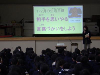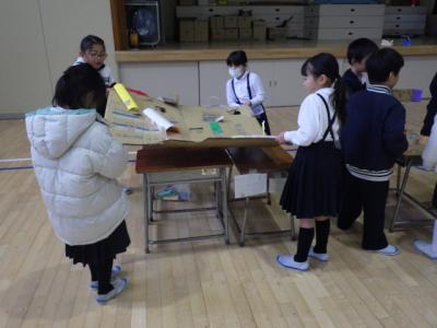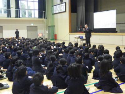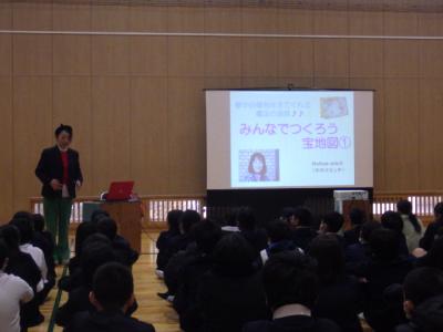6年生がキャリア教育の一環として、「みんなでつくろう宝地図」のお話を聞きました。講師は野々市市教育委員会にお勤めの今井先生です。明るくユーモアたっぷりのお話と、問いかけや体験を交えながらの内容に子どもたちは引き込まれ、あっという間に時間が過ぎていきました。今井先生から学んだことは、「人間には限界をつくり無理と思い込んでしまうことがあること」「しかし、よいイメージを持ち言葉にすることで未来が変わること」です。話を聞いた後は、夢や希望を実現するための「宝地図=ビジョンボード」作りに取り組みました。イメージし言葉に出した夢が叶うことを願って作成します。卒業に向かって大きく夢を膨らませてほしいと思います。