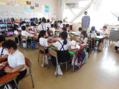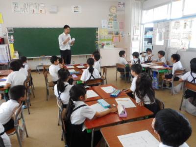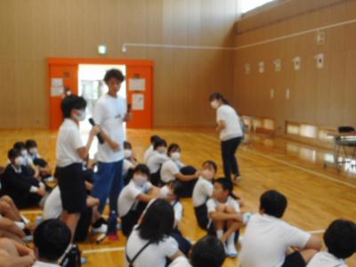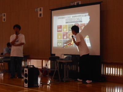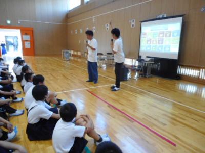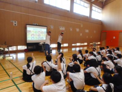 白山市出身のお笑い芸人であるぶんぶんボウルのお二人をお招きし、6年生を対象したSDGsの学習会を行いました。さすがのトーク力と絶妙なコンビネーションで笑いを誘い、クイズやゲームもあり楽しく学ぶことができました。日本では17の目標のうちまだ2つしか達成していないこと、ジェンダー平等の目標では100位以下の評価になっていることなど、意外なことがたくさんありました。質問コーナーでは2人がお笑い芸人という夢を叶えた過程についてもお話を聞くことができました。「好きなことを一生懸命頑張る」力強いメッセージをいただいて終わりました。とよしげさん、マーシーさんありがとうございました。