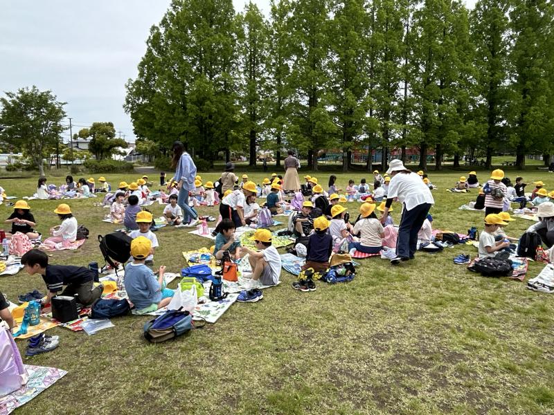 5月15日に遠足で、若宮公園に行きました。子どもたちは、「友達と仲良くする」ことと、「春を見つける」ことを目標に遠足に行きました。公園では、色々な友達と楽しく遊んだり、仲良くお弁当を食べたりすることができました。