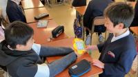 2年生は、今までお世話になった6年生に感謝の気持ちを込めてペンダントを作りました。