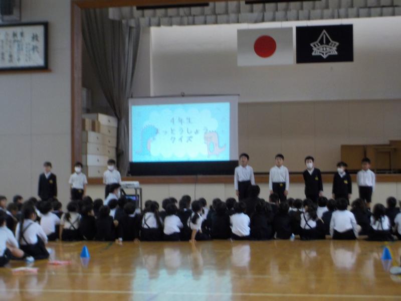 4年生は、松任小クイズを行いました。実行委員の人を中心に、一生懸命練習し、本番では、大きな声で発表することができました。そして、1年生も楽しそうにクイズに参加してくれました。