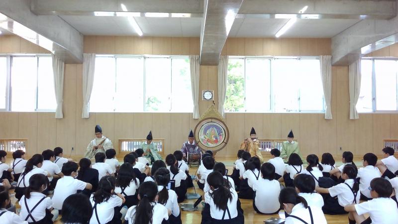 「雅楽」は初めて聴く!という人が多い5年生でしたが,演奏しながら登場していただいた瞬間に