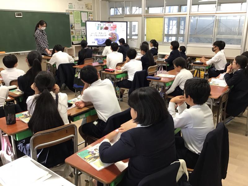クラスごとに、栄養教諭の越川先生に授業に入ってもらい、専門的によりよい献立について学んでいました。