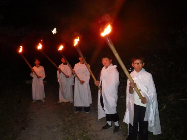 夜のキャンプファイヤーでは、火の神からつながった火のもとで、じゃんけん列車やハンカチおとしをしました。学年みんなで楽しみ、最後にマイムマイムやコロブチカを踊りました。