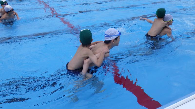 たてわり活動をする1年生を相手にして、おんぶしたりだっこしたりして1年生がプールに慣れるようにしました。