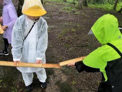 木の実を落とさないように、竹を使ってリレーする「竹でコロコロ」。
