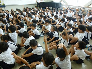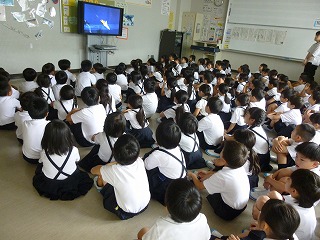 2019年7月30日 13時13分 [先生]1年生全員で集まり、戦争に関するDVDを見ました。
