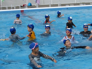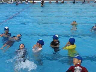 落水時にどうしたらいいのかを聞き、服を着て水に入るとどうなるのかという経験をしました。服を着ている時には無理には泳がず、「浮いて待て」という合言葉があるように、子ども達もペットボトルを使って上手に浮くことができていました!
