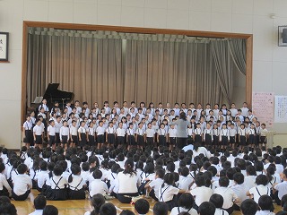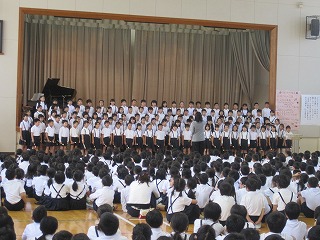 全校のみんなの前で披露するのは初めてのことで、子どもたちも緊張していたと思いますが、普段心がけている「目線」や「口の大きさ」、「表情」などを意識して、堂々と発表することができたと思います。それは、自分たちのふり返りだけでなく、全校のみんなからの感想や、先生方からの好評からも伝わってきました。また、昨年度の音楽会に参加した5年生からは、激励の言葉をもらいました。憧れの5年生からもらった言葉は大きな力になりました。
