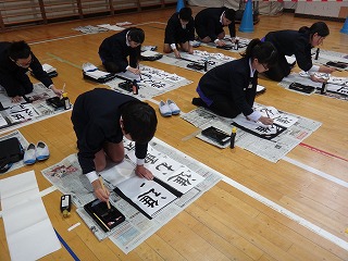 2限目の書き初めの会では、気持ちを込めて「進む勇気」を一画一画丁寧に書いていました。