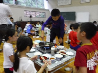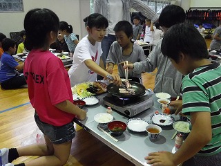 夕食は陶板焼き。集団での初めての夕食ですが、それぞれの役割をこなし、おいしそうにお肉などを頬張っていました。