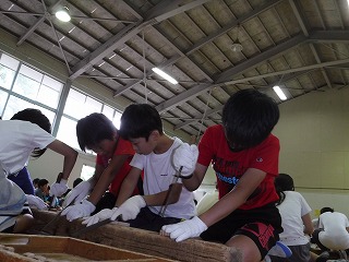 合宿二日目 2017年7月5日 16時44分 [先生] 合宿の二日目は焼き杉クラフト体験です。ベースとなる杉の板は数種類の中から選びましたが、削りや磨き、焼き入れの工程を経ることで、どの子も違った味のある作品を仕上げることができました。普段一緒に学習したり、遊んだりするメンバーでの合宿でしたが、これほど長く過ごすことはめったにありません。子どもたちは互いに助け合い、協力し合いながら活動をすることができました。この経験を生かし、この後も続く六年生を過ごしていってもらいたいです。