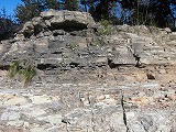 雲龍橋の下の河原では、堆積岩の地層を見たり、植物の化石を見つけたりしました。